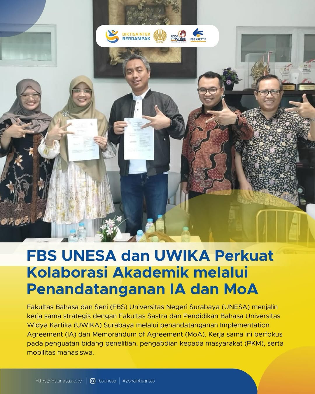 Fakultas Bahasa dan Seni (FBS) Universitas Negeri Surabaya (UNESA) resmi menjalin kerja sama strategis dengan Fakultas Sastra dan Pendidikan Bahasa Universitas Widya Kartika (UWIKA) Surabaya melalui penandatanganan Mem